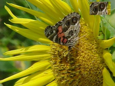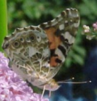 Below,is the beautiful American Lady (Vanessa Virginiensis) I have made these photos larger so you may see what I'm talking about. In photo one to the left. notice the white spot in the middle of a patch of orange (insert)on each of its forewings. In photo two,on the right, notice the underwings have two large black boardered eyespots (insert)This tells you this is an