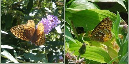 Below,photo to the Left, Is the same species, except it is a Male Great Spangled Fritillary(Speyeria Cybele) Males are Tan to Orange on Forewing vains. are much lighter in color then the females. Photo to the Right,shows the underside of the Male hindwing has pale Submarginal Band with Large Silvor Spots.