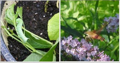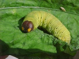 They then turn into a Five-Spotted HawkMoth(Manduca Quinquemaclata)Photo to the right. I was surprised to find out it was'nt a humming bird. but a moth that sort of looks and acts like a hummer.