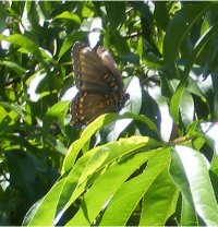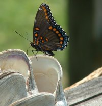 Sometimes when viewing butterflys,they may seem lighter or darker when being viewed on research pages. Light has a lot to do with it when taking photos. These photos below are the same butterfly. The first photo is the red-spotted purple on some quahogs, tasting the salt residuce. The second photo to the right is the Red-Spotted Purple in my peach tree. This butterfly is new to my pond area. Its Hard to distinguish between the male and female as they look alike The only way to tell the difference is seeing them both together. females are very big while males are small. Underside of wings shown below- are brownish black with iridescent blue areas with large orange basal spots(which look red) a row of bright orange spots,two rows of curved iridescent blue dashes near the margins of the wings The undersides of both wings have a row of curved marginal white dashes