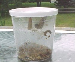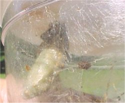 its rear end firmly to the knob. The larva hangs head down and assumes a J shape. Indicating that pupation is only a few hours away. Below,notice the J shaped larva inside the container to the right Photo below |