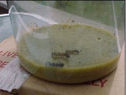 on a certain plant like Thistle for the caterpillar to eat when it emerges from the egg in 3 to 5 days. When I got my kit,there were no eggs.But a container of live caterpillars as shown below. Inside the container below, there is food called Malva, along with some vitamins added. |