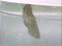 When the shell completes coverage of the pupa, The pupa snuggles inside the chrysalis. It is now time to move the chrysalis to the new home that came with your kit. being very careful removing the paper at the top of the container with them on it. follow the directions that the kit came with. Photo of the pupa inside the chrysais Below. |